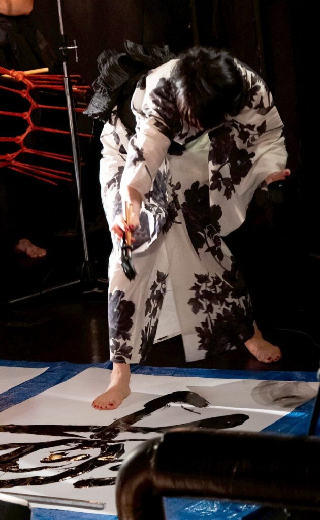書のリズムと音のビートが共鳴する瞬間、筆は躍動し、文字が“生命”を帯びていく。